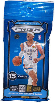 The product is a 2024-2025 Panini Prizm NBA Basketball Fat Pack containing 15 cards featuring players like Jayson Tatum, LeBron James, and Luka Dončić. It is factory sealed and includes cards made of aluminum and card stock. The pack offers serial numbered, short print, base set, exclusive, rookie, parallel, and insert cards from teams like the Golden State Warriors, Boston Celtics, and Los Angeles Lakers.